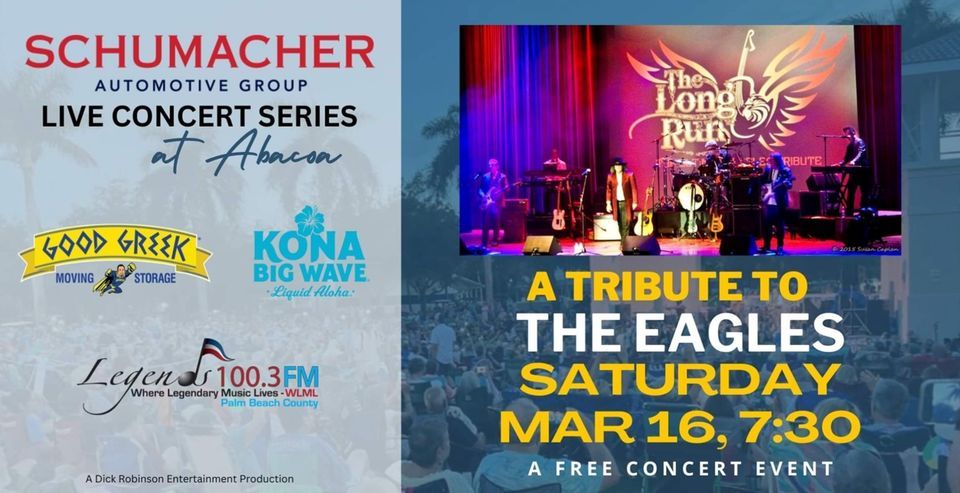 Join us On Saturday, March 16th at the Abacoa Amphitheater for the free Eagles Tribute Band concert! Gates open at 5pm and the concert starts at 7:30pm. Enjoy the food, music, and stop by our Schumacher Auto Group tent for some fun giveaways! We can't wait to see you there!