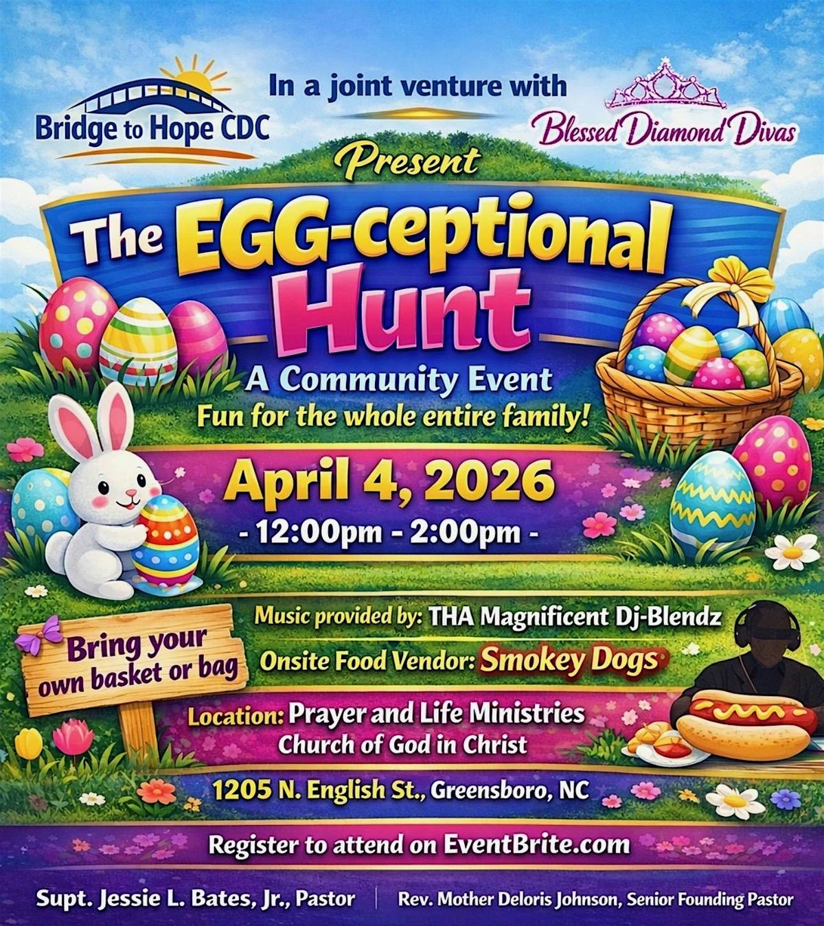 Gear up for a day packed with fun and excitement at The EGG-ceptional Hunt! Join us in person for an unforgettable adventure as you search every nook and cranny for hidden treasures. Bring your friends, family, and plenty of energy, it’s all about teamwork, laughter, and cracking eggs along the way. Enjoy live music from one of the triad’s top DJs, “THA Magnificent Dj-Blendz,” plus delicious sausages and hotdogs from the city’s favorite “Smokey Dogs.” Don’t miss this egg-citing event filled with smiles and surprises!
