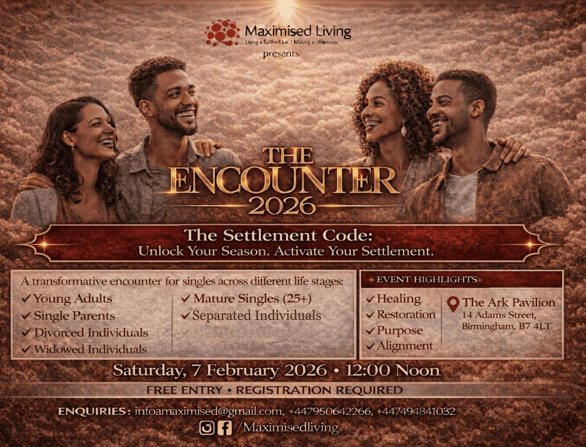 The Encounter 2026: The Settlement Code is a transformative, high-impact experience for singles ready to heal, realign, and step confidently into their next season. Hosted by Maximised Living, this powerful gathering creates space for restoration, clarity, and purpose—helping you settle the past and activate what is next.
