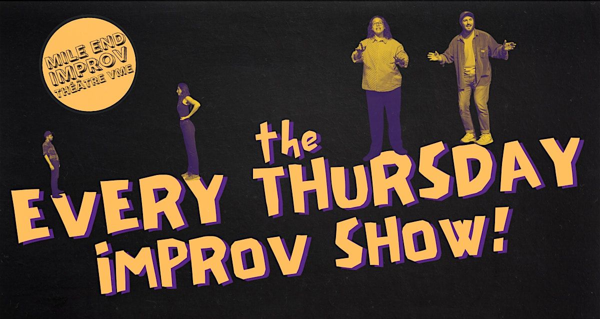 The Every Thursday Improv Show has been running since April 2022 on the main in Montreal's historic Mile End! The show happens in Variations Mile End's Theatre VME, a cozy black box theatre where the best improvisers in the city convene to entertain. Each week, a different themed with one thing in common - hilarity! Always on Thursday, always at 8:30pm! Wanna know the show details? Check our page on Facebook: https://www.facebook.com/everythursdayimprovshow/