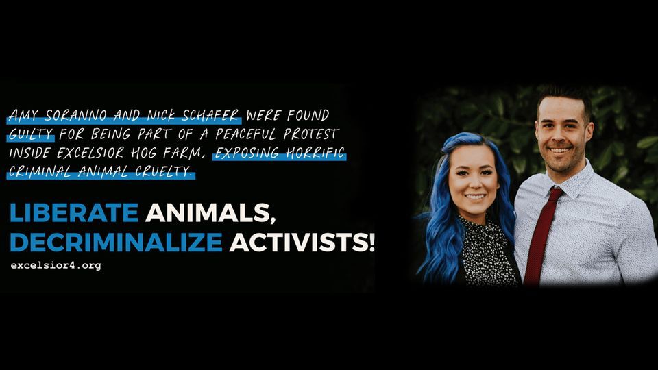 On April 28, 2019, the Excelsior 4 and nearly 200 other activists descended on Excelsior Hog Farm, conducting a ‘Meat the Victims’ action. Approximately 130 activists staged a protest outside of the farm property, while 65 others occupied the farm and live-streamed what they saw - row upon row of pregnant pigs crammed inside metal crates the size of their own bodies, unable to even turn around or move for months on end. So many pigs were severely neglected, frothing at the mouth, crippled, left to suffer and die from sickness and injuries. As a result, they generated mass National and International media attention. Amy, Nick and Roy were arrested at this event; however, Amy was the only activist taken into custody and charged.