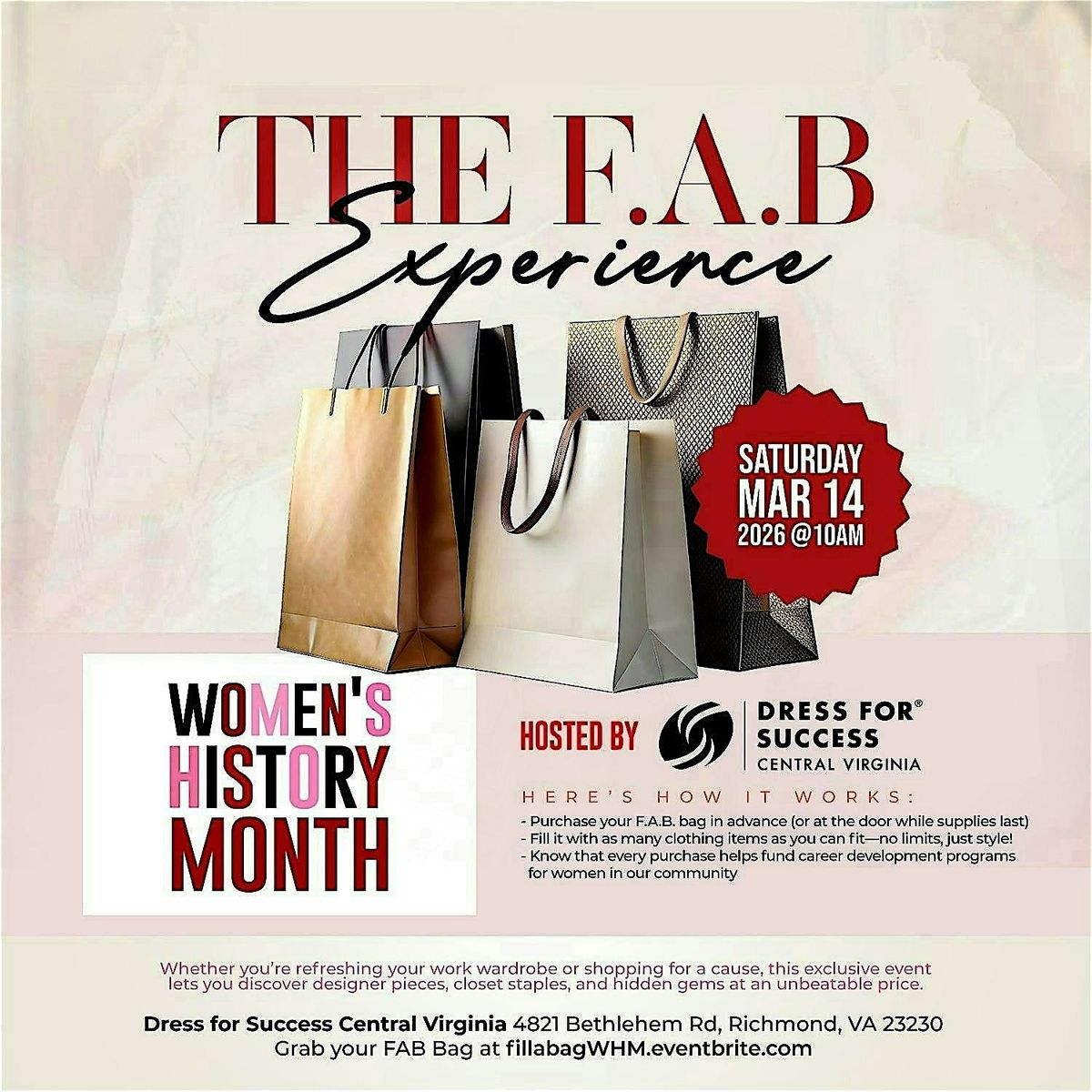 As a proudly woman-led nonprofit, Dress for Success Central Virginia works every day to help women build confidence, secure employment, and advance in their careers. Shopping The F.A.B. Experience is more than a style moment—it’s an investment in women’s economic independence and long-term success.