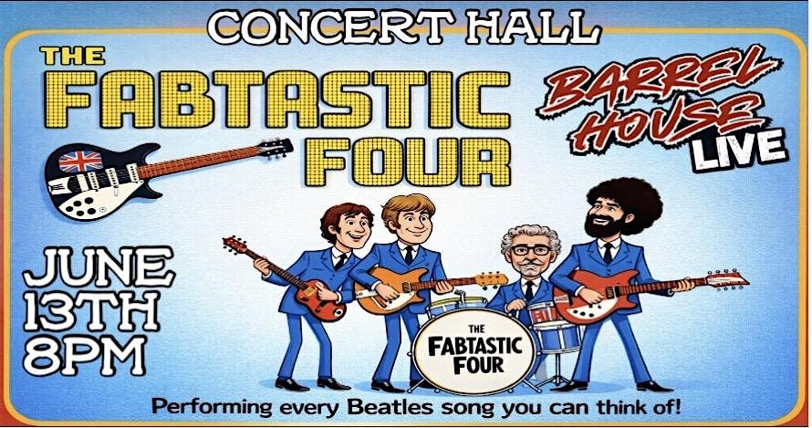 Barrel House Live – Fallston, MDCome celebrate the Fab Four on Saturday, June 13 at 8 PM. The Fabtastic Four brings every classic Beatles moment to life—“Hey Jude,” “Let It Be,” “Come Together,” and more—right on Barrel House’s stage.