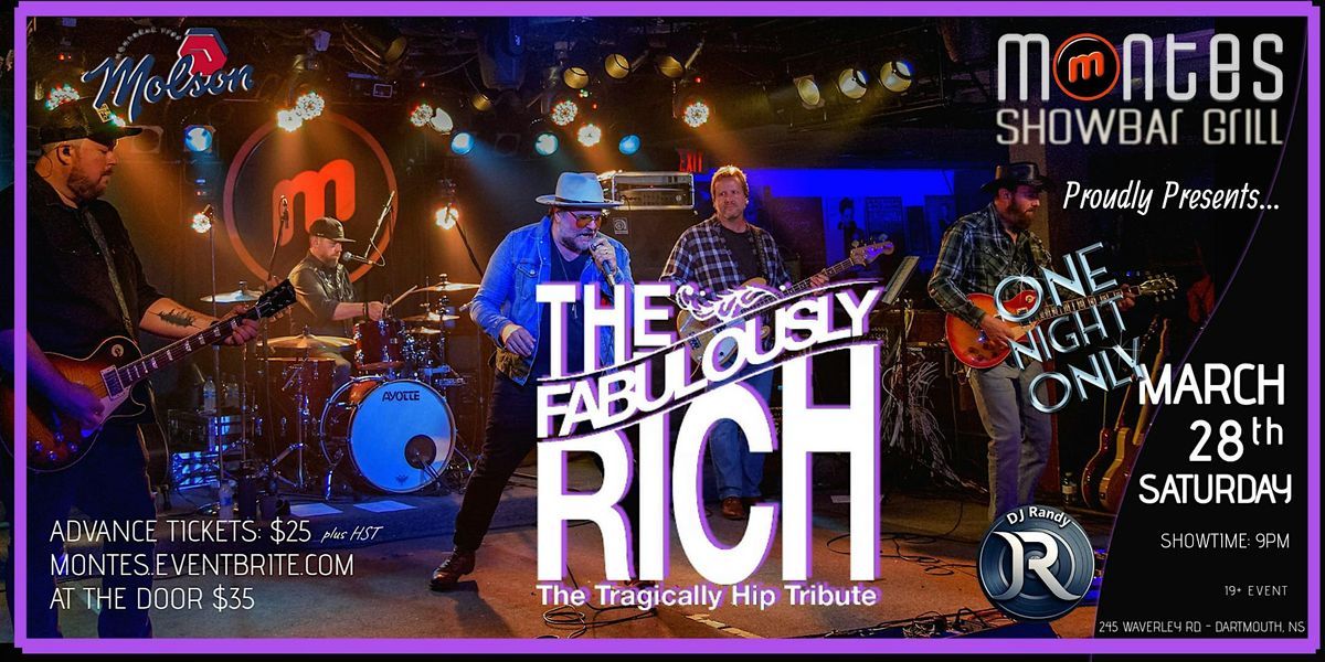 Welcome to The Fabulously Rich - A Tribute to the Tragically Hip! Join us for a night of amazing music and good vibes at Monte's Showbar Grill. Get ready to rock out to all the classic hits from the iconic Canadian band, The Tragically Hip. It's going to be a night to remember, so grab your friends and come on down for a fantastic time!