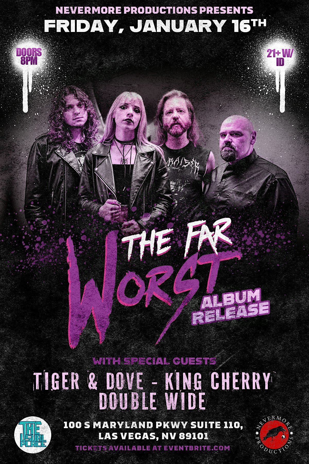Nevermore Productions presents Las Vegas’s own female-front rock band The Far Worst as they release their new album! Joined by the electrifying sounds of Double Wide, the raw rock of Tiger & Dove, and vamp rockers King Cherry this show is going to be rock n roll mayhem!