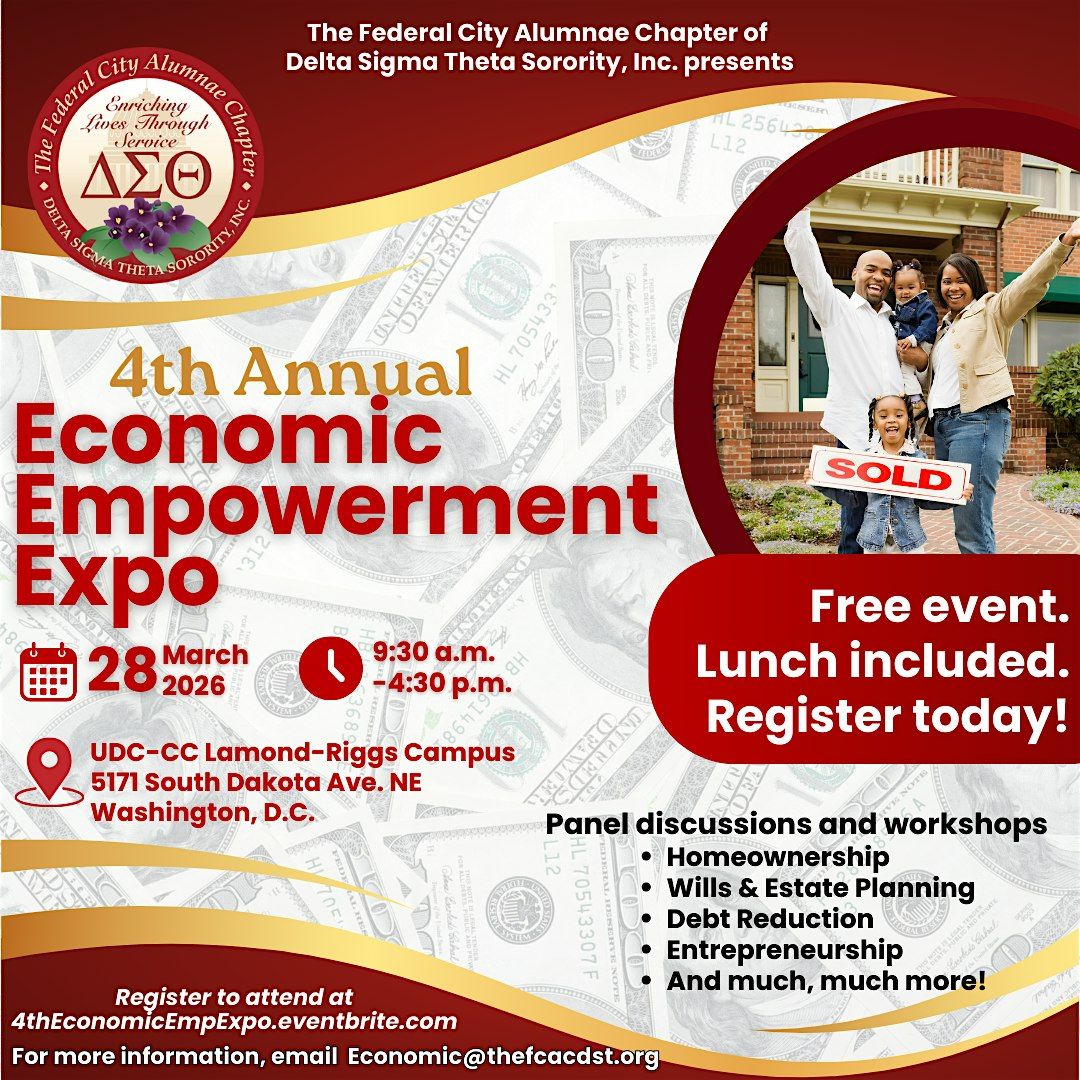 Join the Federal City Alumnae Chapter of Delta Sigma Theta Sorority, Inc. for an empowering and informative day at our 4th Annual Economic Empowerment Expo! This dynamic experience is designed to equip you with practical tools, trusted resources, and real-world strategies to strengthen your finances and build a secure future. Whether you're focused on budgeting, investing, entrepreneurship, or long-term financial planning, this expo will connect you with experts and community partners committed to your success. Location: UDC-CC Lamond-Riggs Campus 5171 South Dakota Ave NE at 9:30 AM. Lunch will be provided. Come ready to learn, connect, and take the next step toward economic empowerment!