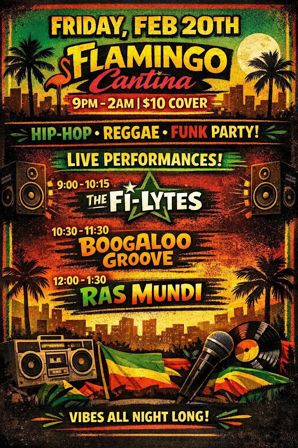 Get ready for a night of unstoppable grooves and global flavor at Flamingo Cantina as The Fi-Lytes, Boogaloo Groove, and Ras Mundi take the stage for an electrifying live music experience. From soulful funk and psychedelic rhythms to Latin-inspired Funk and reggae-rooted sounds, this lineup brings deep grooves, feel-good energy, and dance-floor-moving performances all night long.