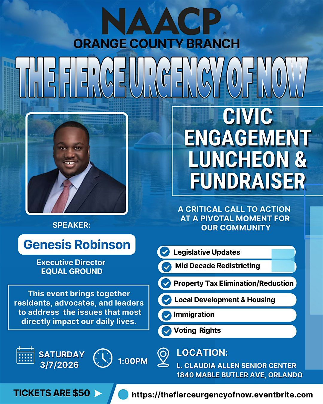 The NAACP Orange County Branch Civic Engagement Luncheon & Fundraiser is a critical call to action at a pivotal moment for our community. “The Fierce Urgency of Now,” brings together residents, advocates, and leaders to address the issues that most directly impact our daily lives.