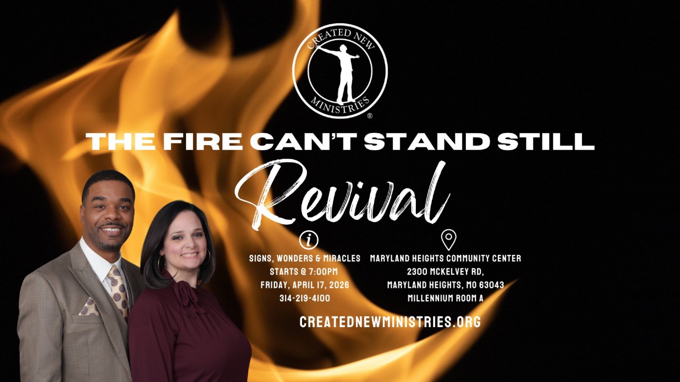 Mark your calendars to attend "The Fire Can't Stand Still Revival" Friday April 17, 2026 @ 7:00pm. Maryland Heights Community Center. If your hungry for a genuine move of God, join us and let's all come together and petition God to move in this region! The Fire Can't Stand Still!