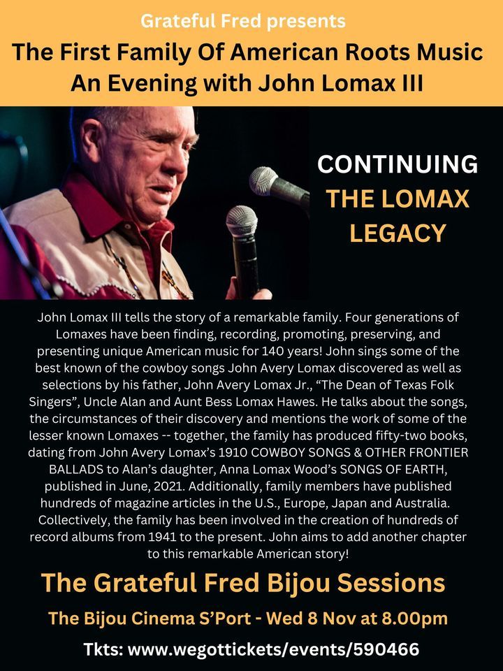 This evening Grateful Fred welcomes John Lomax III to the award-winning Bijou Cinema in Southport town centre.