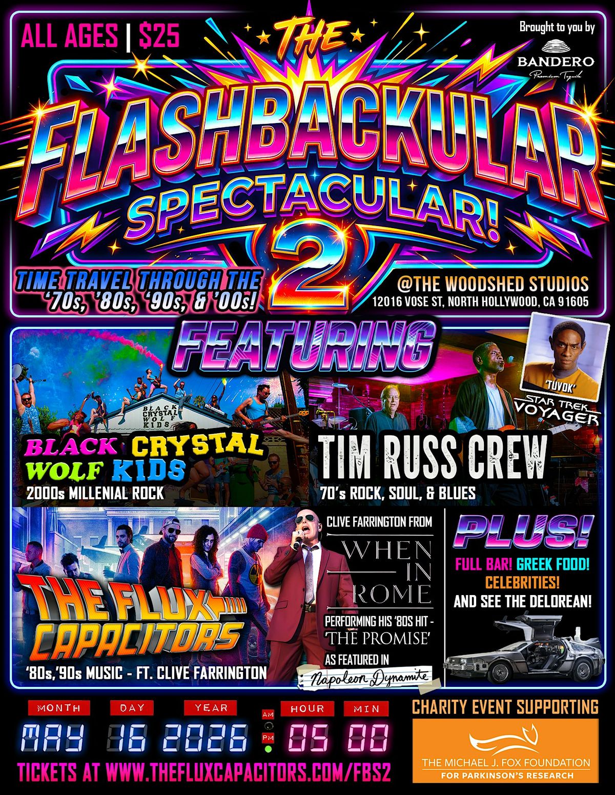 Join us for an unforgettable concert experience with 3 top nostalgia bands that will take you on a time-tour of the '70s, '80s, '90s, & 2000s! And 2 very special musical guests - TIM RUSS (Tuvok from Star Trek Voyager), and CLIVE FARRINGTON (When In Rome) performing his mega-hit 'THE PROMISE' with The Flux Capacitors band! Dive into a blast from the past with great vibes, awesome people,celebrities, and a night filled with surprises! Don’t miss out —this is the sequel you’ve been waiting for!