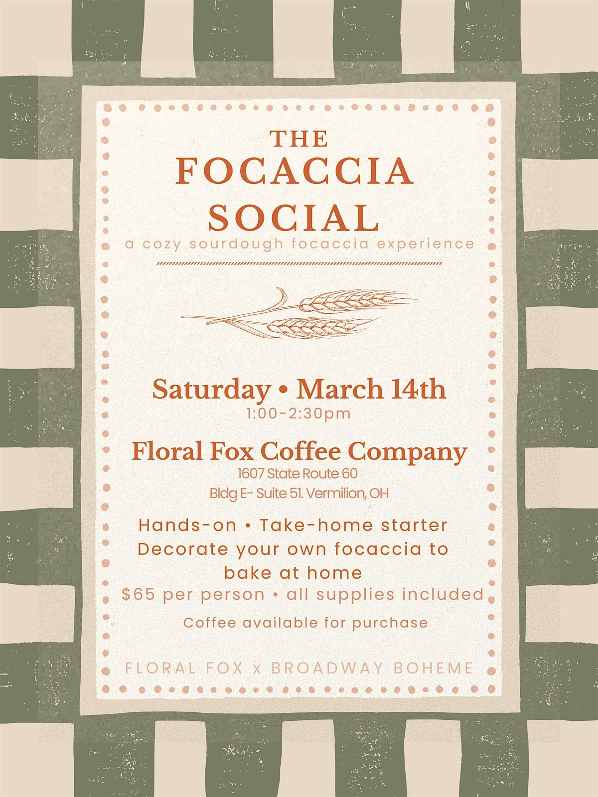 The Focaccia Social is a cozy, hands-on sourdough focaccia experience hosted at Floral Fox Coffee Company. They are located in Building E - Suite 51.