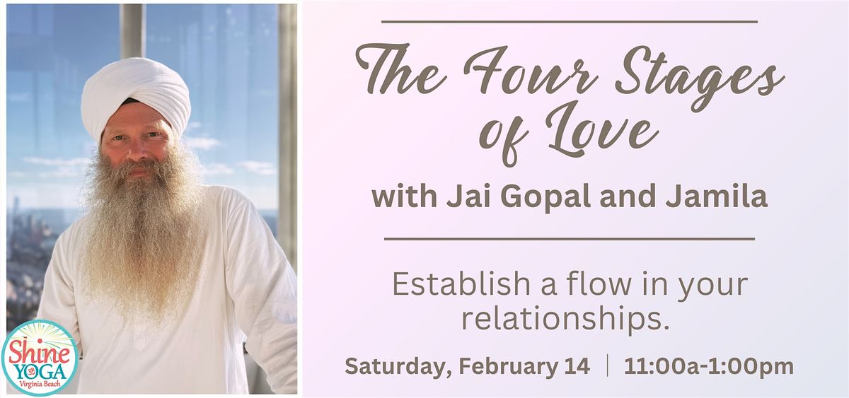 There are four stages of love through which every relationship goes and not knowing these is the reason that many relationships fail. Join Jai Gopal and Jamila for this Kundalini Workshop on Valentine's Day and learn how to establish a flow in relationships, which allows you to see the unseen in each other.