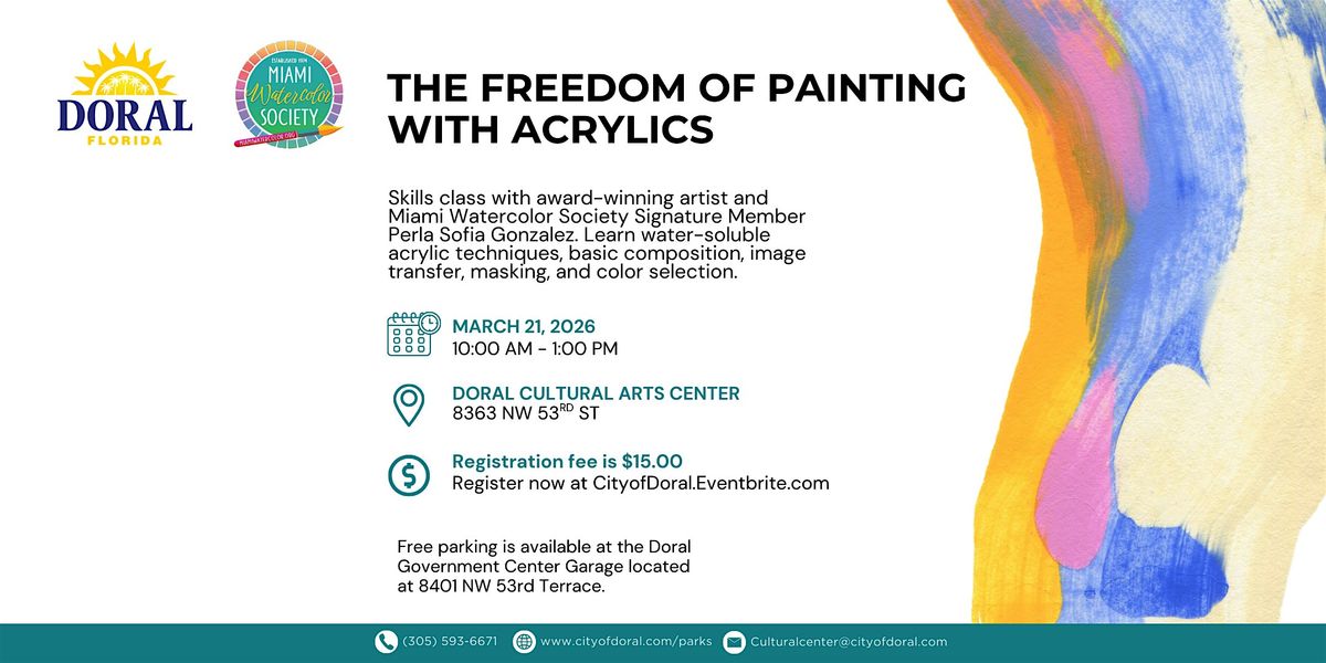 Immerse yourself in the freedom of painting with water-soluble acrylics in this hands-on skills class led by award-winning artist Perla Sofia Gonzalez, a Signature Member of the Miami Watercolor Society.Participants will learn essential techniques including how to properly prime surfaces, transfer images, apply basic composition rules, use masking to protect areas of the artwork, and confidently select a cohesive color palette. The class will also explore pattern creation, texture, and layering techniques to build dynamic and unique backgrounds.