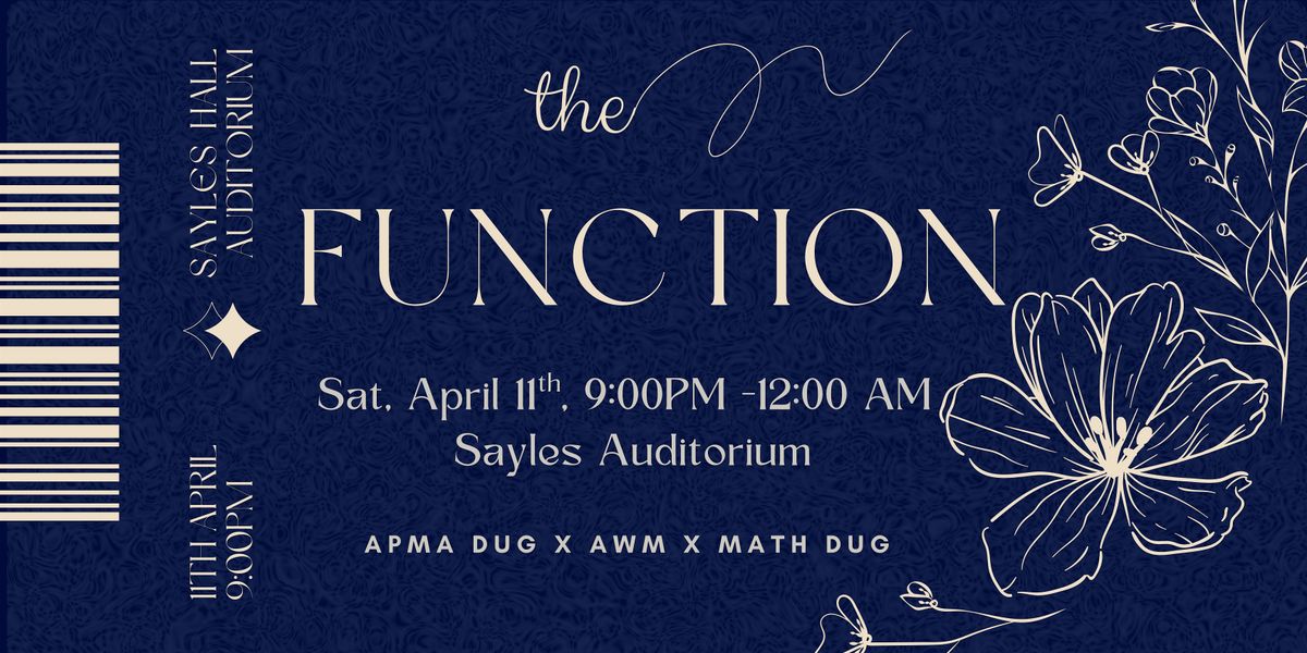 The Function is the first annual formal dance and social co-sponsored by the Association for Women in Mathematics, The APMA DUG and the Math DUG. All Brown students are invited to join us on April 11th from 9pm - 12am at Sayles for dancing, snacks, and fun with friends! There will be games, senior superlatives, and a photobooth to to capture the night. Whether you like math or are just looking for a fun night out, The Function is the perfect opportunity to dress up (if you want), hang out, and celebrate the end of the year!