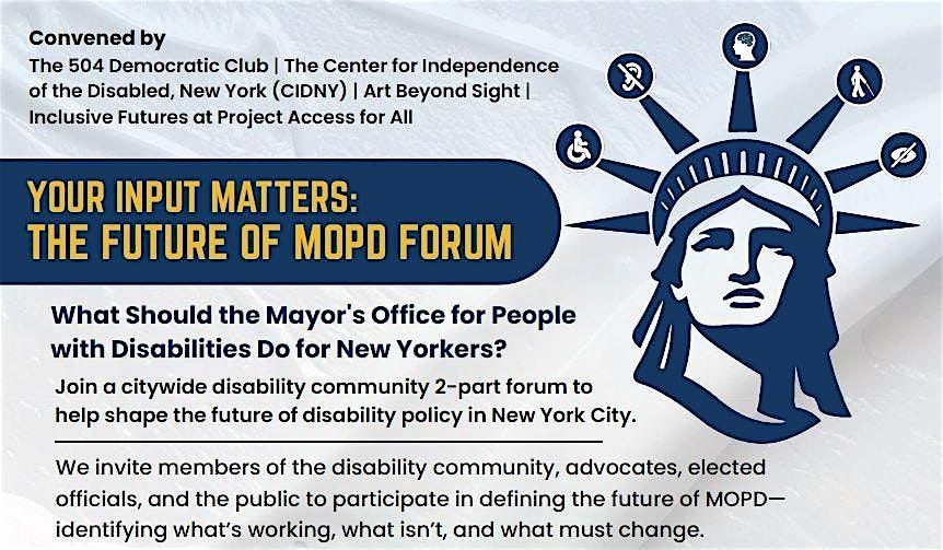 Your Input Matters: The Future of MOPD Forum 2026 is a two-part, citywide disability community convening focused on surfacing the most urgent barriers facing New Yorkers with disabilities and generating practical recommendations for government action. With a new MOPD Commissioner and a new mayoral administration, this forum is designed to help define what MOPD should deliver—by elevating community priorities, identifying what’s working and what isn’t, and clarifying what must change.