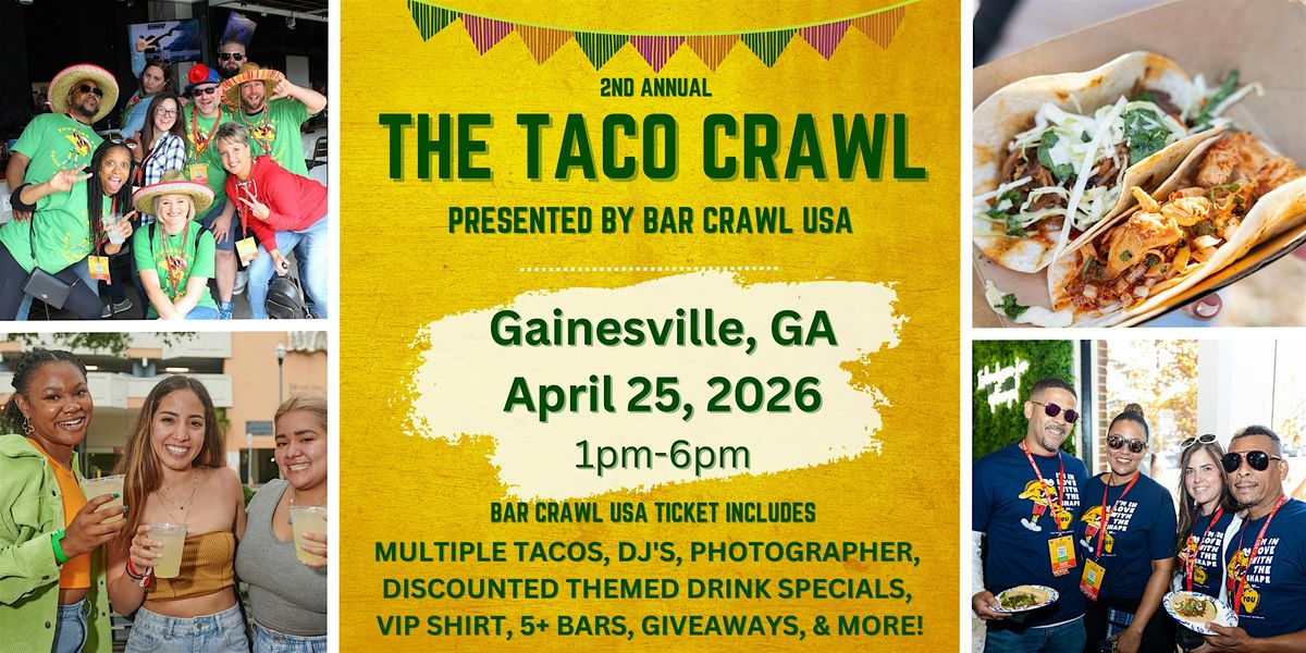 The Taco Crawl presented by Bar Crawl USA is coming back to Downtown Gainesville on April 25th. Enjoy eating tacos, sipping margaritas and dancing your taco loving butt off!