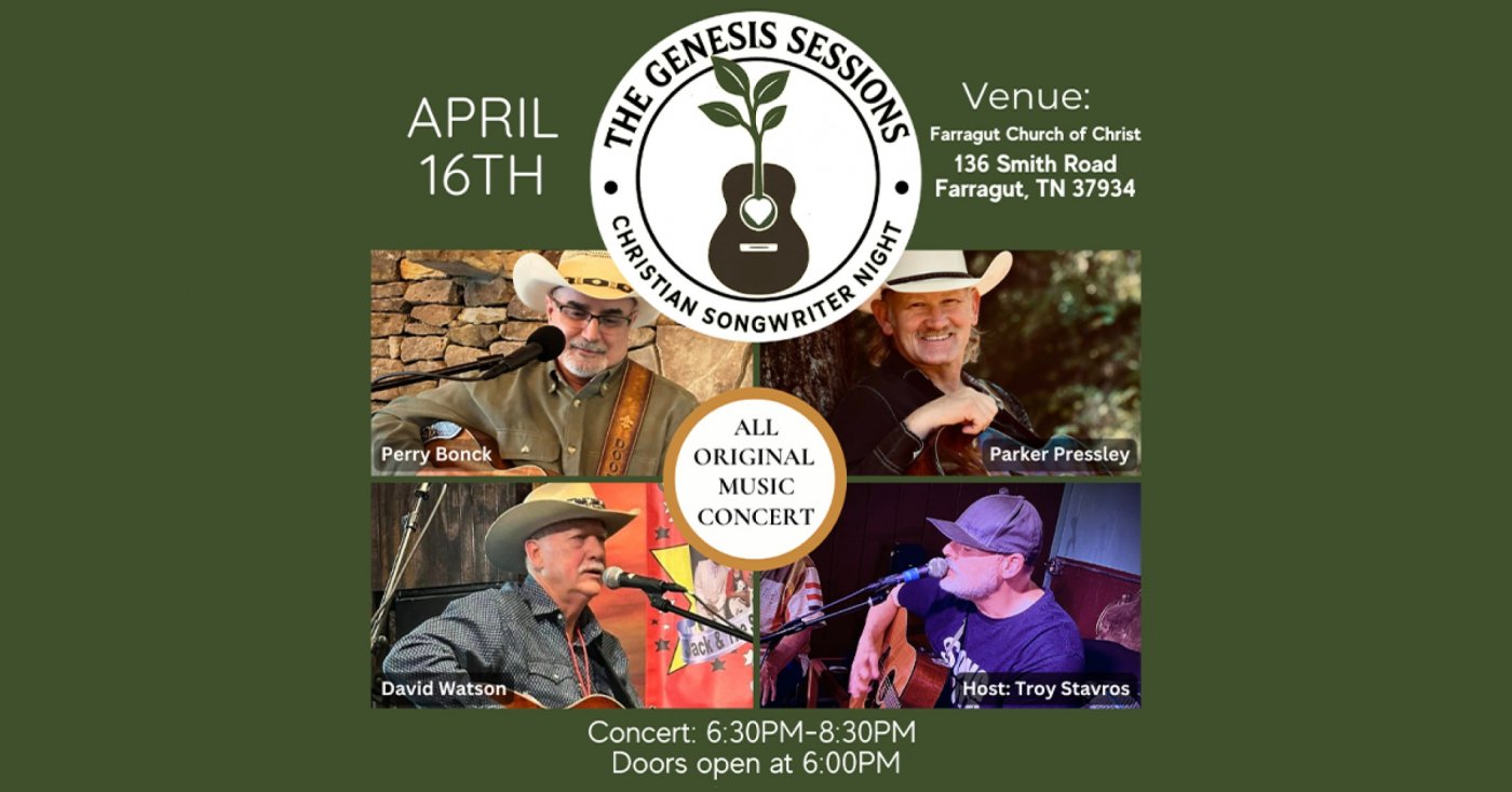 Hosted at the Farragut Church of Christ in Farragut, Tennessee, this FREE EVENT brings together talented Christian songwriters to share their heartfelt creations and the faith-filled journeys that inspired them.