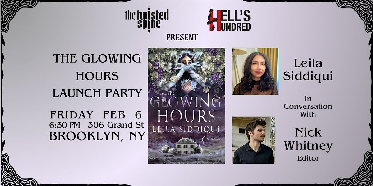 All attendees will receive a copy of THE GLOWING HOURS, as well as a free tote bag and drink at The Twisted Spine courtesy of Hell's Hundred!