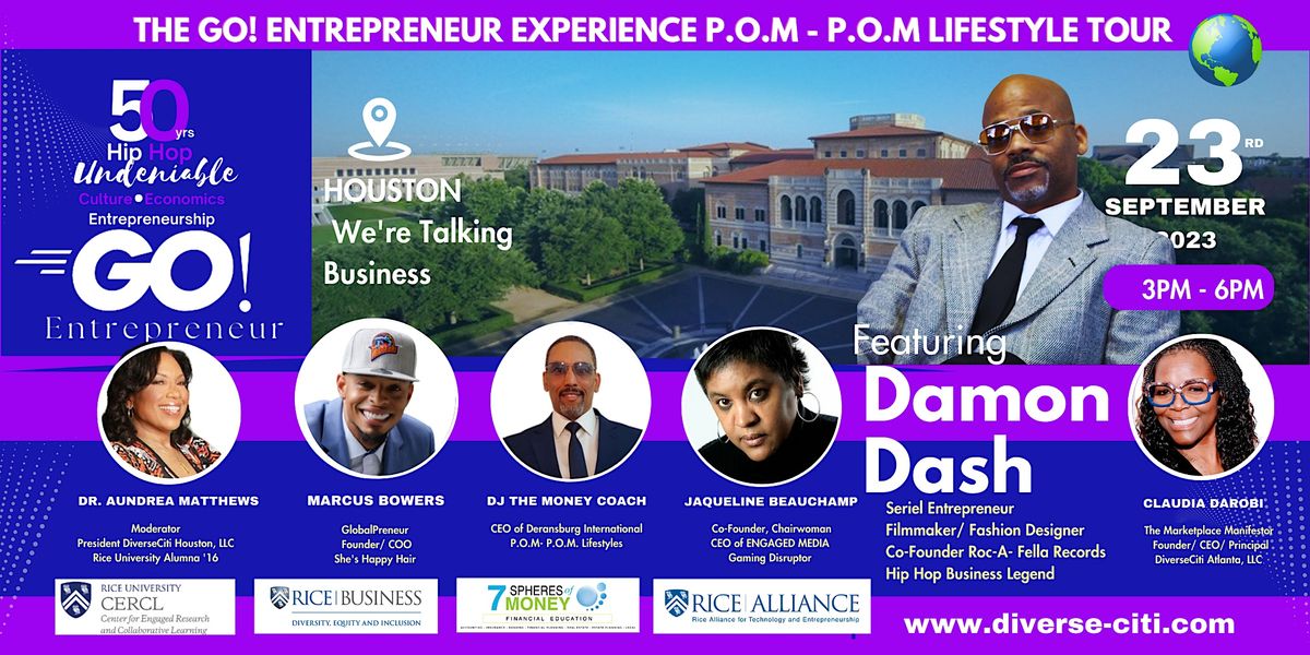 Houston, Texas - It is a great pleasure to present an extraordinary event celebrating the undeniable influence and impact that 50 years of Hip Hop has had on the world of business and entrepreneurship. The Go! ENTREPRENEUR Experience P.O.M - P.O.M Lifestyles Tour aka (Go!Entrepreneur Tour) featuring the legendary New York Hip-Hop mogul, Damon Dash, kicks off a promising unforgettable experience on September 23, 2023, at Rice University.