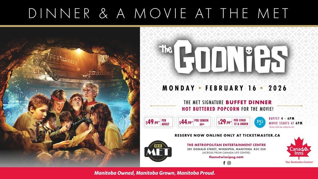 Hey You Guys! Adventure, treasure and total 80s nostalgia await with Dinner & A Movie: The Goonies (1985) at The MET. Our Dinner Buffet opens at 4pm and will be available until 6pm. Before the movie starts at 6pm, we will bring you hot buttered popcorn. Remember to refresh your beverages at our stand-up bar before the show starts! There will be a short 15-minute intermission halfway into the movie where we will serve coffee and dessert to your table for you to enjoy during the second half! Please note tables are communal seating, unless you buy the entire table. Ticket Prices: ? Adults: $49.99 ? Seniors (60+): $44.99 ? Children (12 & Under): $29.99 All prices include taxes, plus fees per person. Reserve your table now at ticketmaster.ca!