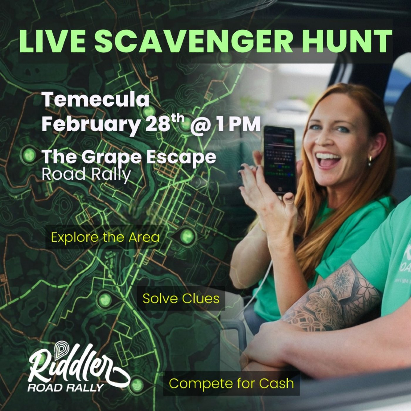 The Grape Escape Road Rally sends you on a puzzle-driven adventure exploring Temecula. Follow GPS-guided routes, travel from one riddle to the next, and let each solved puzzle push you closer to the finish. With steady teamwork, sharp thinking, and quick decision-making, every moment adds up in this competitive race against the leaderboard. Play solo or with a team of up to five. 10% of every entry fee fuels a growing cash jackpot with a $500 minimum, split 60/25/15 among the top 3 teams. Play smart to win, and escape boredom with an unforgettable adventure.