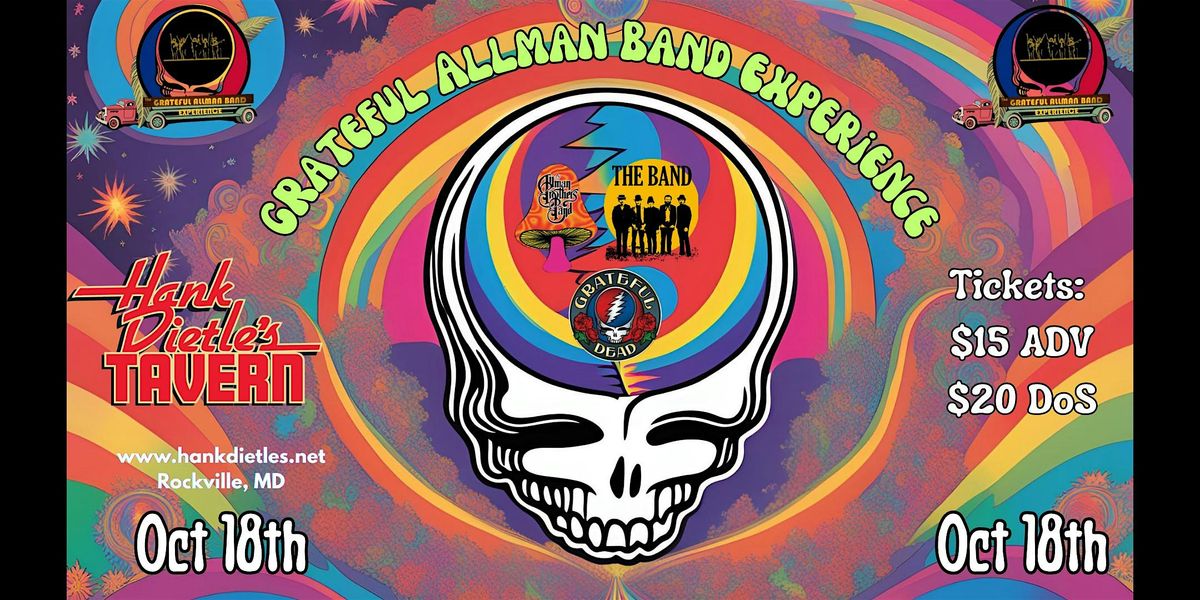 Featuring an all-star lineup of some of the best mid-Atlantic regional band players from Danger Bird, Covered with Jam, Montgomery Warlocks, and The Crimestoppers; The Grateful Allman Band Experience celebrates the music of the Grateful Dead, Allman Brothers, and The Band and has been touring from the Carolinas to New Jersey for over a decade. Relive the music from the venerated Watkins Glen Summer Jam Music Festival. While the band is not a full-on tribute band (we couldn’t afford all the set and wardrobe changes), we do promise to celebrate the music and times of these legendary bands. We can’t wait to see you on the dance floor!