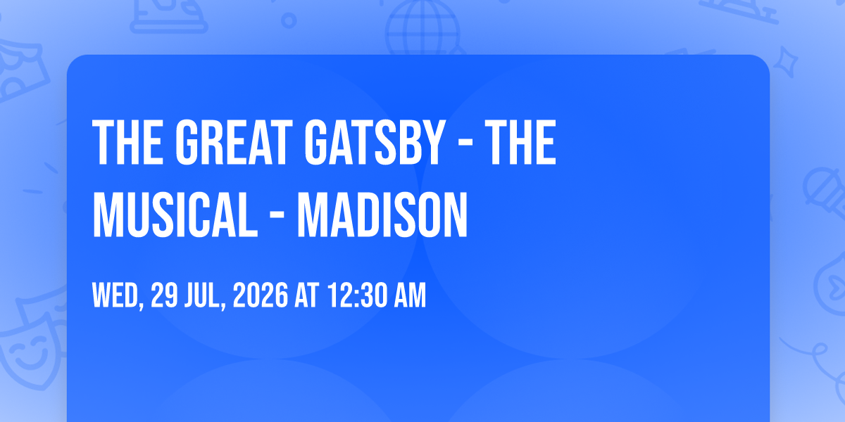 π Location: 43.0746, -89.3883β¨ Experience the magic of The Great Gatsby - The Musical - Madison, where moments become memories that last a lifetime! ποΈ The iconic Overture Hall - Overture Center in Madison, WI sets the perfect stage for an unforgettable celebration on August 2nd, 2026 at 11:30 PM. π It's been a curated experience that brings together the best of entertainment and innovation, creating an atmosphere of wonder and excitement. From the moment you arrive, you'll be immersed in a world where the ordinary transforms into the extraordinary. π Book early to secure your place in what promises to be an event that will be talked about for years to come!