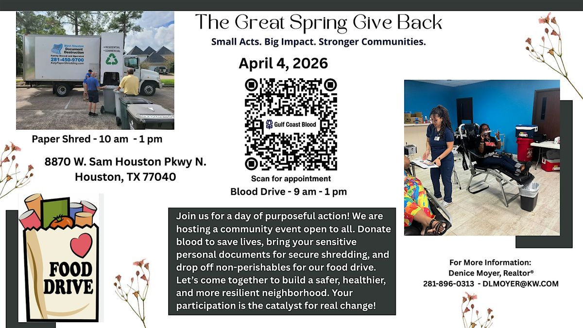 Come and support the community in The Great Spring Give Back brought to you by RCD Property Group. There are 3 ways you can participate: 1. Give back for a life - be a blood donor. Use the QR code to sign up for an appointment. All donors will receive a T-Shirt and a free A1C test (glucose test)2. Give back for those in need - Bring non-perishable food items to donate in support of the food drive. The collected food will be distributed to food pantries for those in need.3. Our gift to YOU - Come and shred your personal papers securely and safely for FREE!!!!! No businesses please. The address is 8870 W. Sam Houston Pkwy N., Houston, TX 77040.Call or text Denice at 281-896-0313 for information and questions. We are looking forward to seeing you there!