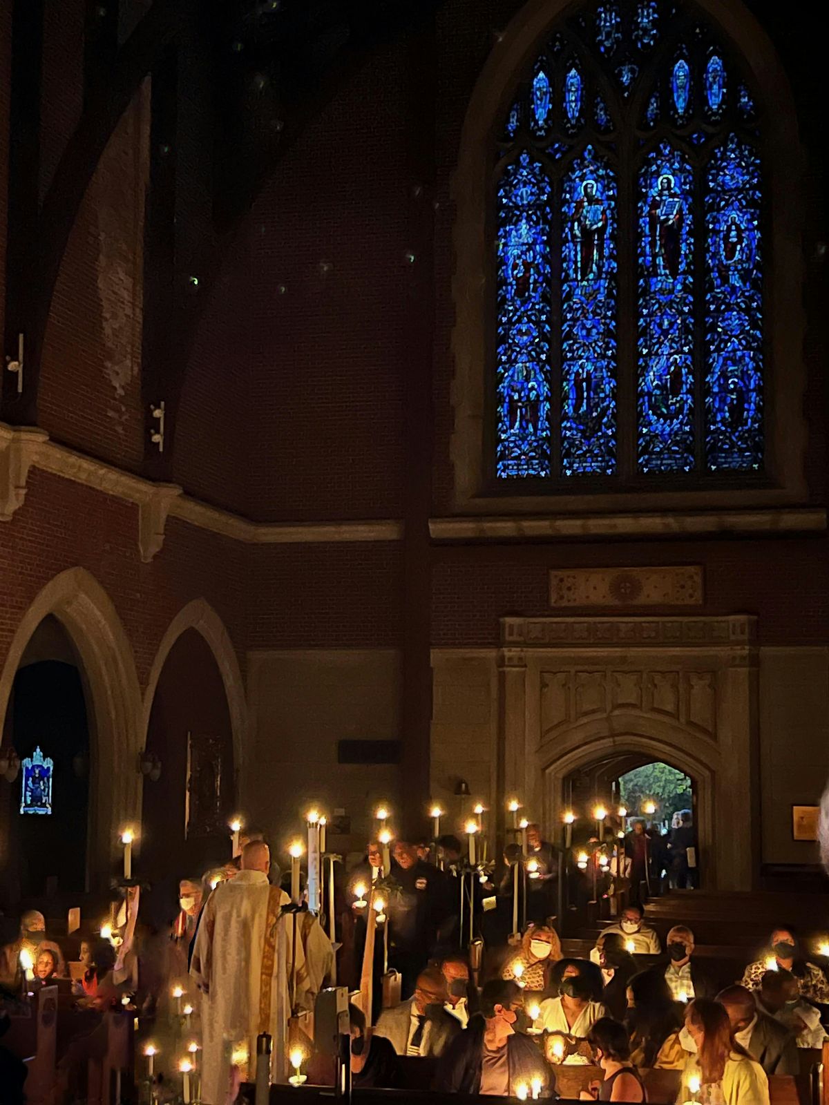 The service begins on easter Eve at dusk outside the church, as we gather around a newly kindled fire. The Paschal Candle, is lit—symbolizing hope and the light of Christ. Everyone processes into the darkened church, following the flame, as a hauntingly beautiful chant called the Exsultet is sung by our deacon.