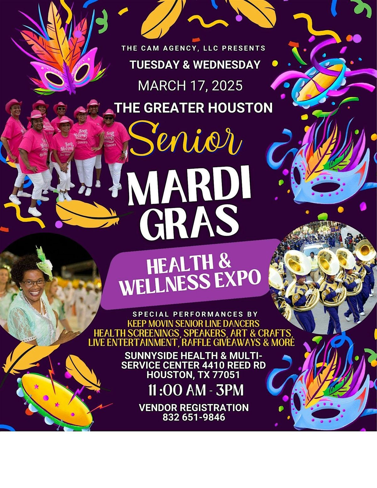Join us for ouston Senior Mardi Gras Health & Wellness Expo March 17, 2026 at the Sunnyside Health & Multi-Service Center 4410 Reed Rd Houston, TX 77051. We’re inviting all seniors, families, caregivers, and veterans to this event. During this event our goal is to empower, inspire and provide you with vital resources and information to positively impact your current situation.