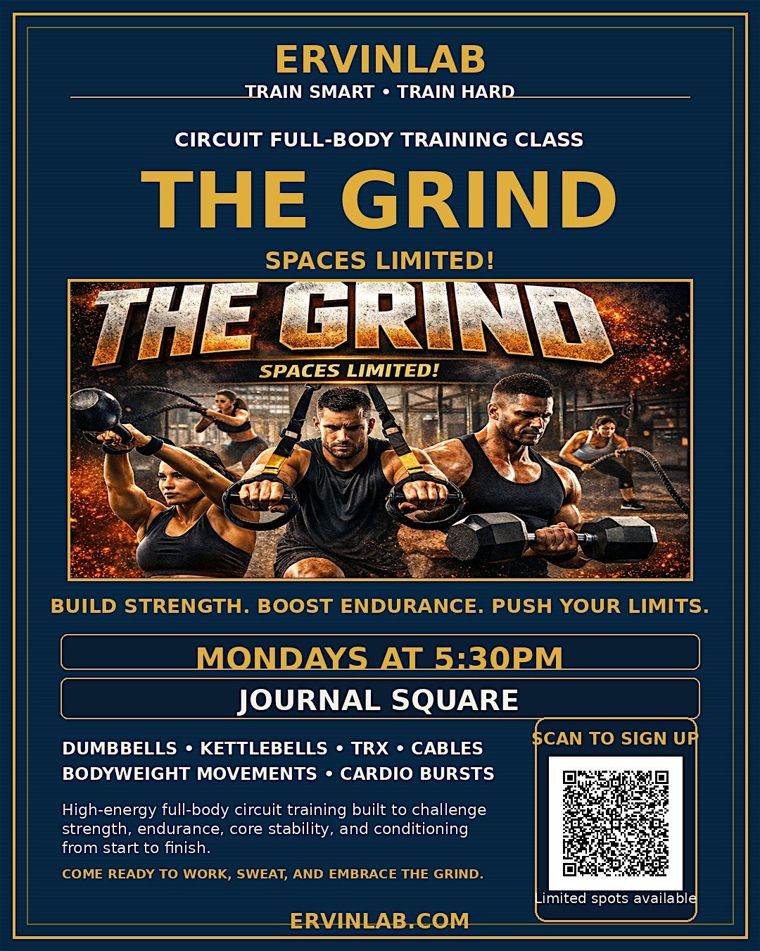 The Grind is a high-energy, full-body circuit designed to build strength, improve endurance, and push your limits. This class rotates through multiple training stations combining strength exercises, functional movements, and cardio bursts to keep your body working from start to finish. Using equipment such as dumbbells, kettlebells, TRX, cables, and bodyweight movements, each station targets different muscle groups while keeping your heart rate elevated. Expect a mix of lower-body power, upper-body strength, core stability, and conditioning drills that challenge both muscles and mindset. The format keeps you moving, minimizes downtime, and maximizes results helping you burn calories, build lean muscle, and improve overall fitness. Come ready to work, sweat, and embrace The Grind.