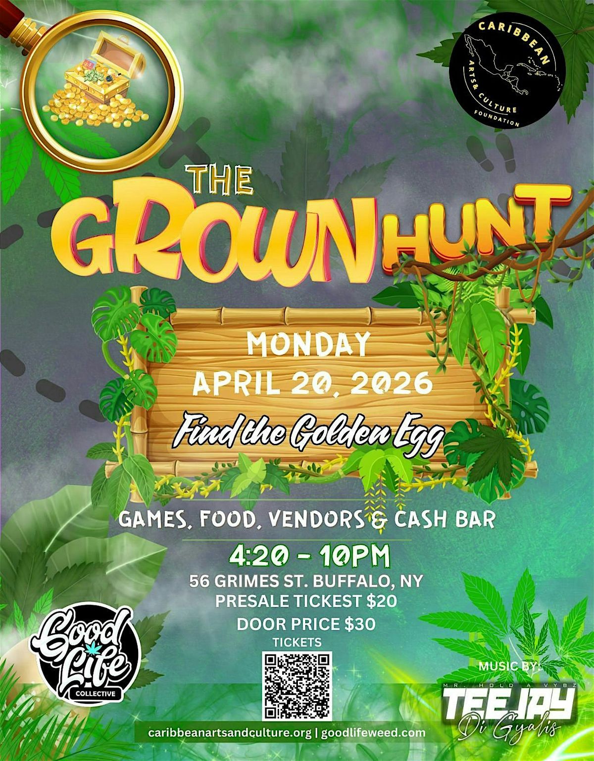 The Grown Hunt is a 4/20 themed experience for adults 21 and over featuring a night of games, music, and interactive activities. Guests will explore the venue through a scavenger-style hunt, participate in fun competitions, and connect with local vendors while enjoying a laid-back atmosphere. The event blends entertainment, community, and a unique twist on the classic hunt designed specifically for grown-ups.