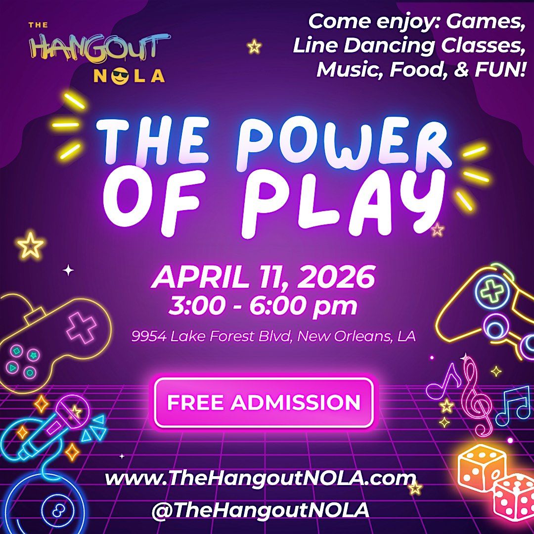 Join us in person for an epic experience at The Hangout NOLA! Dive into the Power of Play and unleash your creativity, energy, and fun vibes with awesome people around. Don’t miss out on good times, laughter, and unforgettable moments. Come ready to connect, chill, and play your heart out!