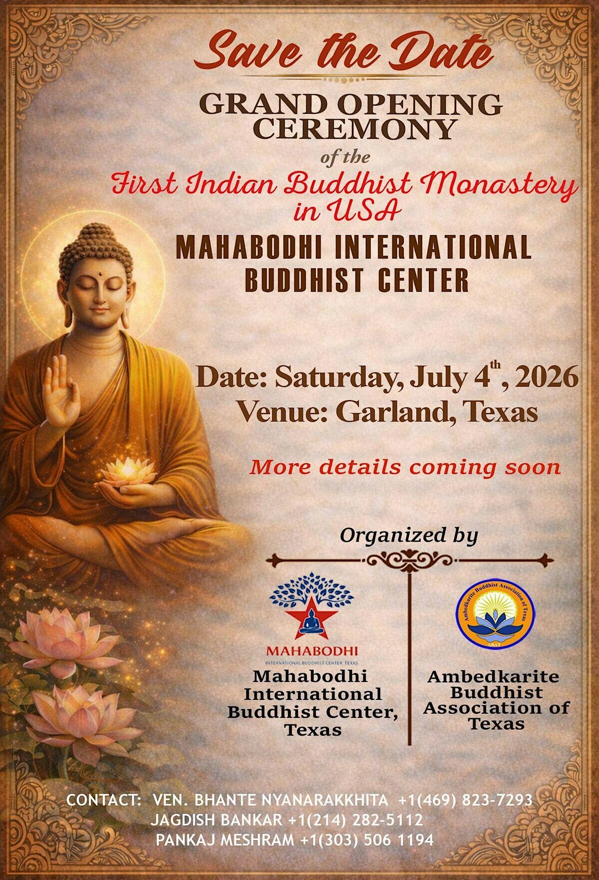 Join us for an unforgettable day as we celebrate the grand opening of the very first Indian Buddhist Monastery in the United States of America. This in-person event promises a unique experience filled with culture, spirituality, and fraternity values. Don't miss out on being part of this historic occasion!