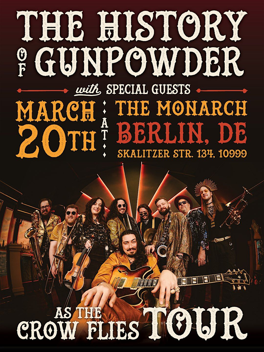 Canadian Freakout Orchestra, The History of Gunpowder, is stopping in Berlin for their EU wide tour. This group is bringing violin, horns, synthesizers and blues vocals together in experimental, expansive arrangements to The Monarch Bar. Think Nick Cave, Radiohead, Tom Waits and Mars Volta had a progeny. Infamous in Canada, they are now gracing EU stages with their chaotic might. Get your tickets fast, it will sell out!