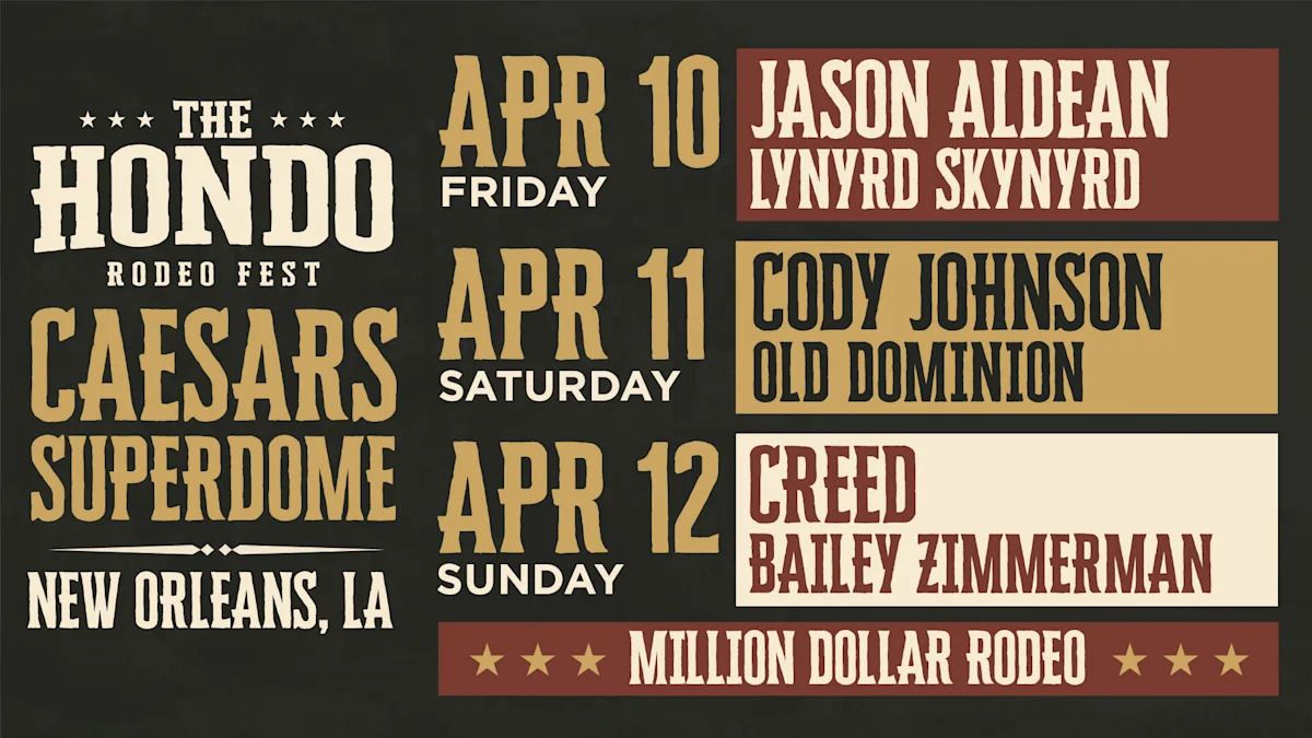 📍 Location: 29.9511, -90.0812🌟 Step into a world of wonder at The Hondo Rodeo Fest - (Friday) with Jason Aldean, Lynyrd Skynyrd, where extraordinary moments await! 🏛️ Located at Caesars Superdome in dynamic New Orleans, LA, this event will become the talk of the town. 📅 Join us on April 10th, 2026 at 11:00 PM for a celebration that defies the ordinary. ✨ This curated experience brings together the best of entertainment, culture, and community spirit. Every detail has been thoughtfully planned to ensure an unforgettable experience for all our guests. 🎯 Take advantage of this opportunity to be part of something special. 🎊 Early registration is recommended as space is limited!
