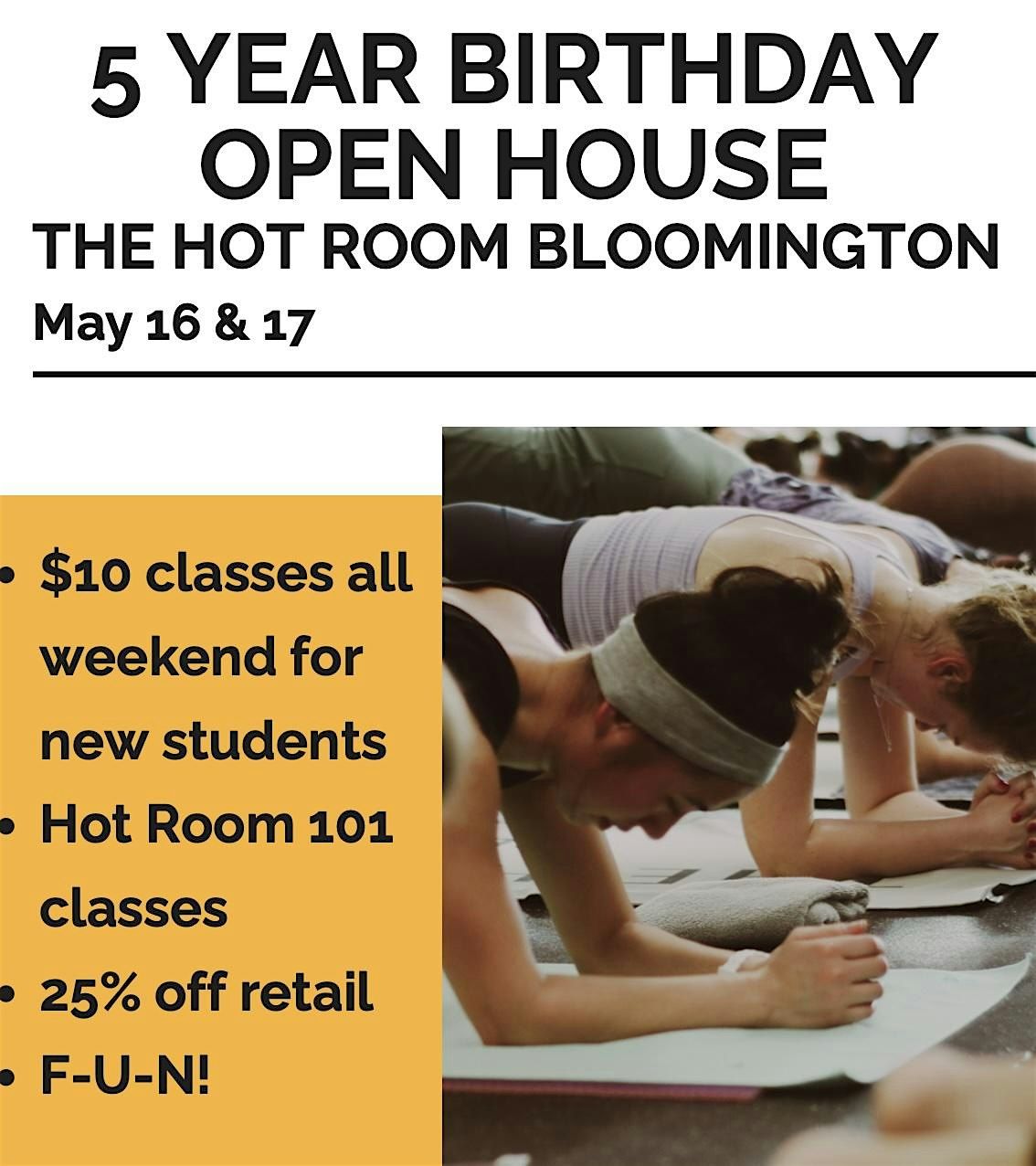 Join The Hot Room Bloomington as we mark our 5 Year Anniversary with a fun Open House! $10 classess all weekend!