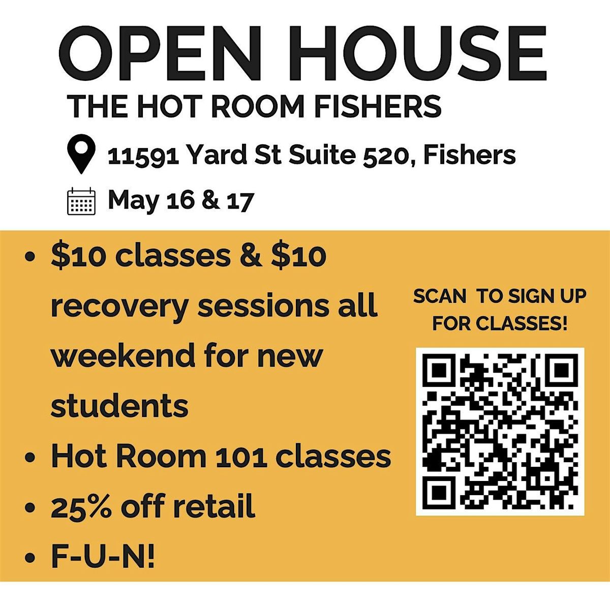 Come join us in person for The Hot Room Fishers Open House! It's the perfect chance to check out the space, meet cool people, and see what we're all about. Whether you're a regular or just curious, everyone’s welcome. Swing by, say hi, and experience the vibe firsthand. Can't wait to see you there!