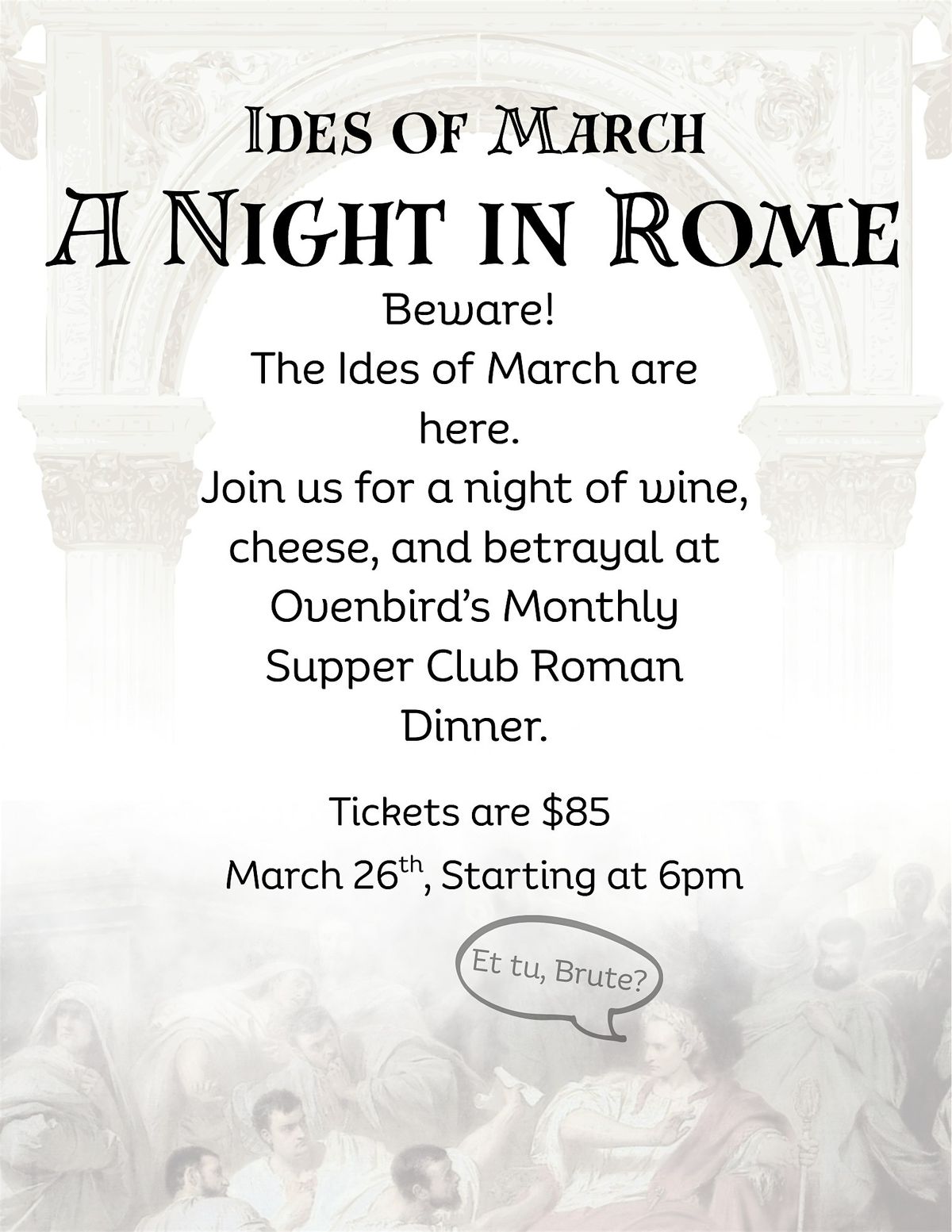 Join us for an unforgettable evening at Ovenbird | Austin on March 26, 2026 at 6:00 PM (Central Time). Dive into the vibes of traditional Roman faire, drinks, and company. Whether you're a history buff or just looking for a fun night out, this event promises a chill atmosphere and good times. Don’t miss out on this unique experience!
