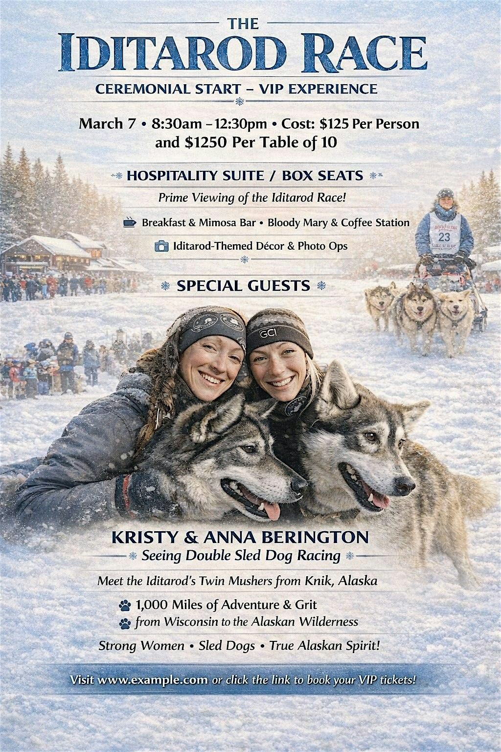- Special Presentation by Kristy & Anna Berington — hear insider stories and race insights from Iditarod champions