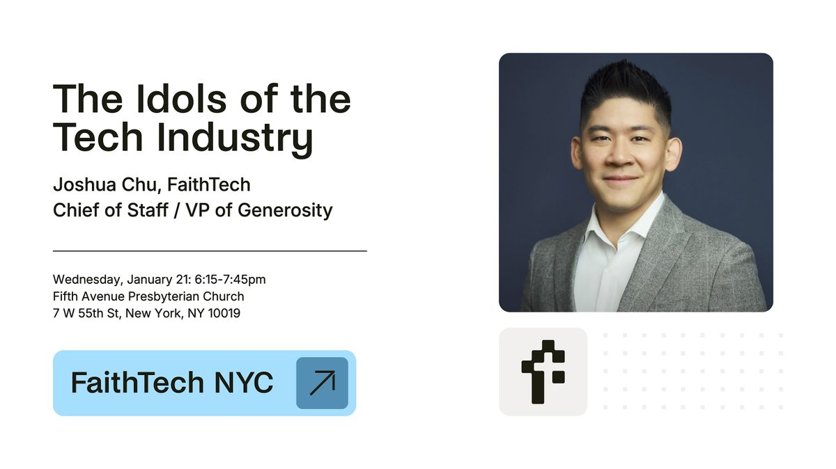 On Wednesday, January 21, Joshua Chu (Chief of Staff / VP of Generosity at FaithTech) will speak about the idols that quietly compete for our attention, ambition, and allegiance in the tech world.