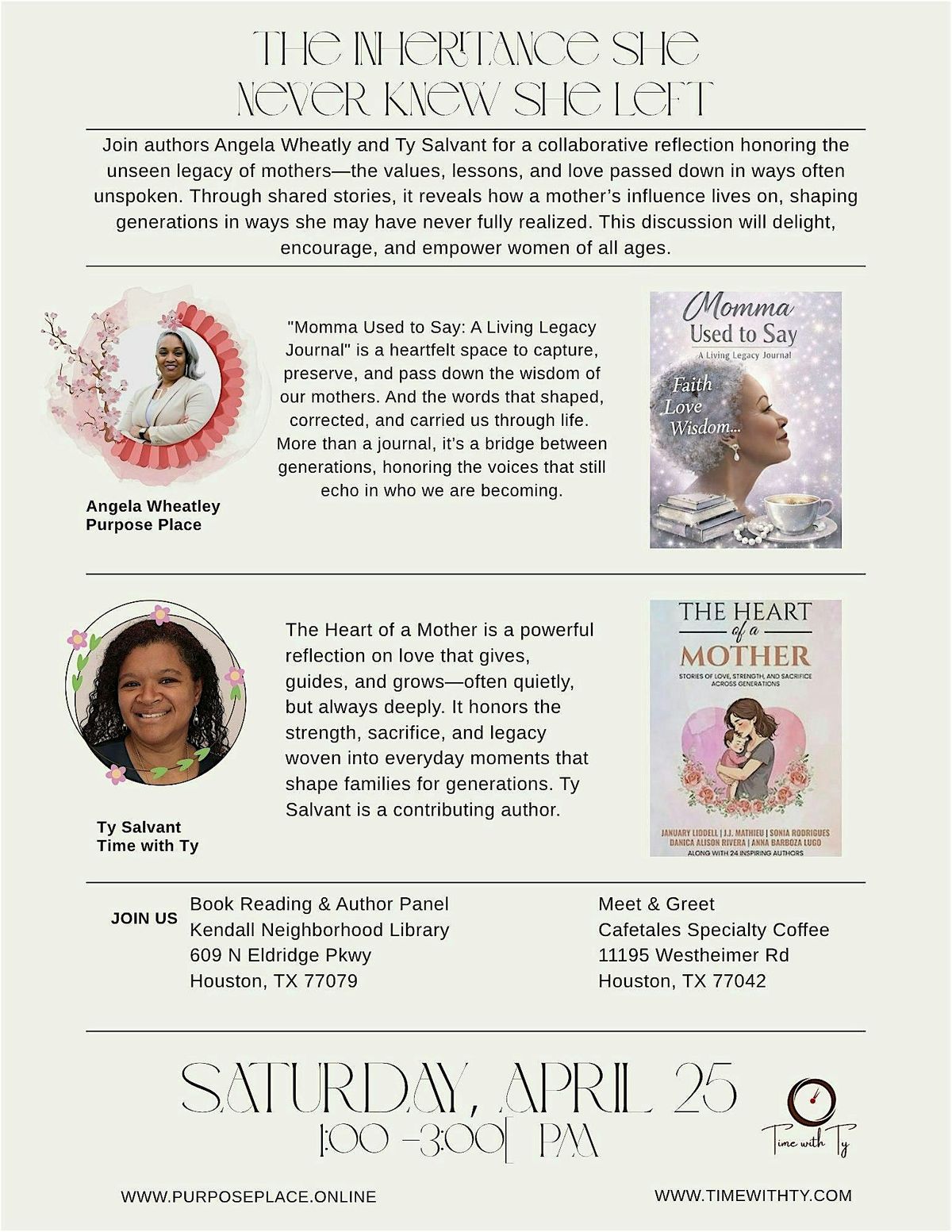 Join authors Angela Wheatley and Ty Salvant for a collaborative reflection honoring the unseen legacy of mothers the values, lessons, and love passed down in ways often unspoken. Through shared stories, it reveals how a mother’s influence lives on, shaping generations in ways she may have never fully realized. This discussion will delight, encourage, and empower women of all ages.