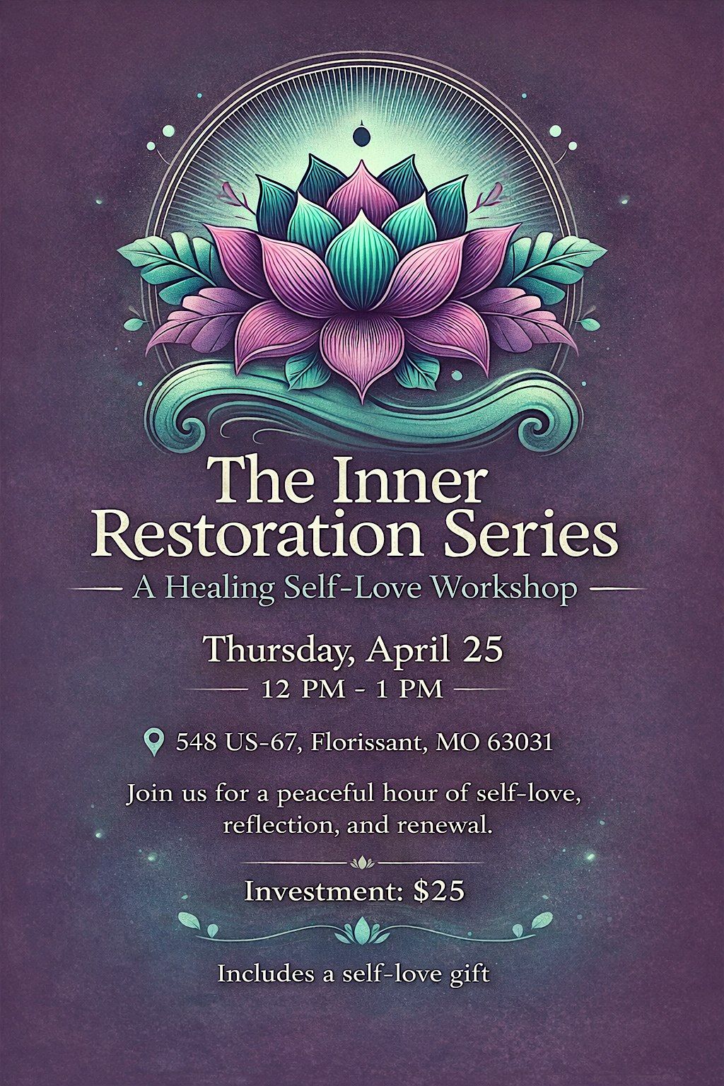 The Inner Restoration Workshop is a guided self-love experience designed to help you slow down, reconnect, and return to yourself. Through intentional reflection, breathwork, and gentle awareness practices, this space supports emotional clarity, self-trust, and inner healing. Come as you are and allow yourself to be held, seen, and restored.