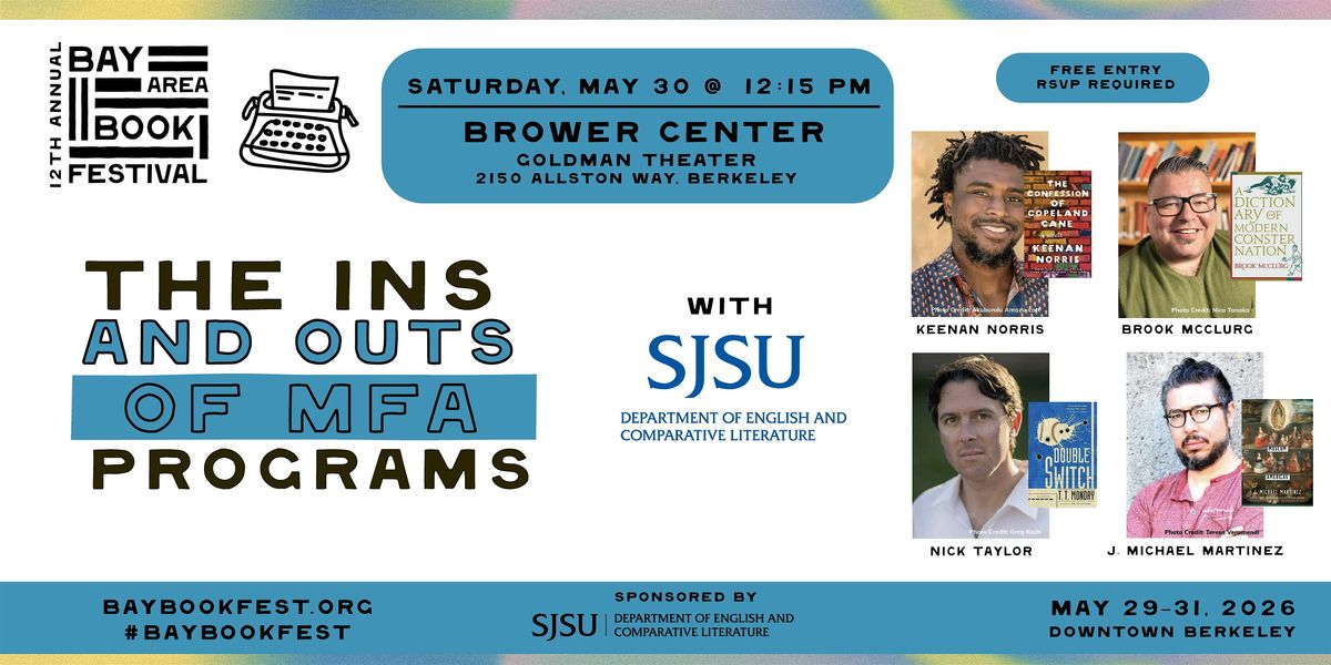 Join the Creative Writing professors of San Jose State University for a combined panel and workshop where the professors will discuss the ins and outs of MFA programs and lead attendees in a series of writing exercises for prose writers and poets. SJSU MFA program coordinator Nick Taylor and faculty members Keenan Norris, J. Michael Martinez and Brook McClurg have guided numerous aspiring writers through graduation and on to publication and they look forward to sharing tools of their trade with the public. Whether you're an aspiring MFA student, a long-time writer, or simply an interested reader, consider yourself invited.