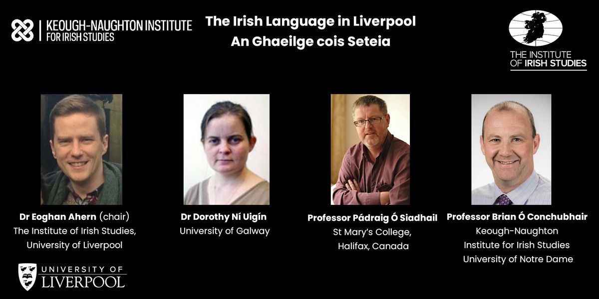 The panel will discuss Liverpool’s role in providing a safe haven for Irish Speakers as well as source of significant Irish-Language authors and activists. Themes will include the activist roles played by the Irish language in Liverpool and Merseyside in general, and conversely Liverpool’s contribution the Irish language, its history, literature, revival.