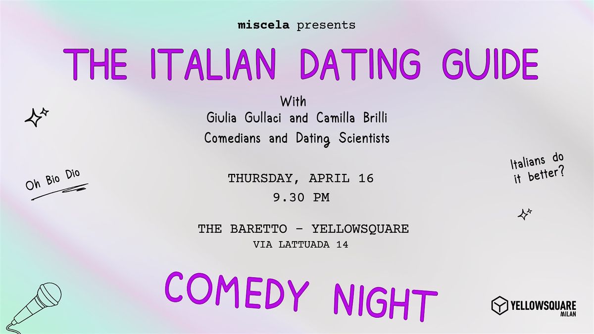 A comedy night by Miscela in which Giulia Gullaci and Camilla Brilli, Italian comedians, will debunk the "italians do it better" myth, especially in dating life, through advice, warnings, and sharing experiences that will make you laugh but also think (a lot).