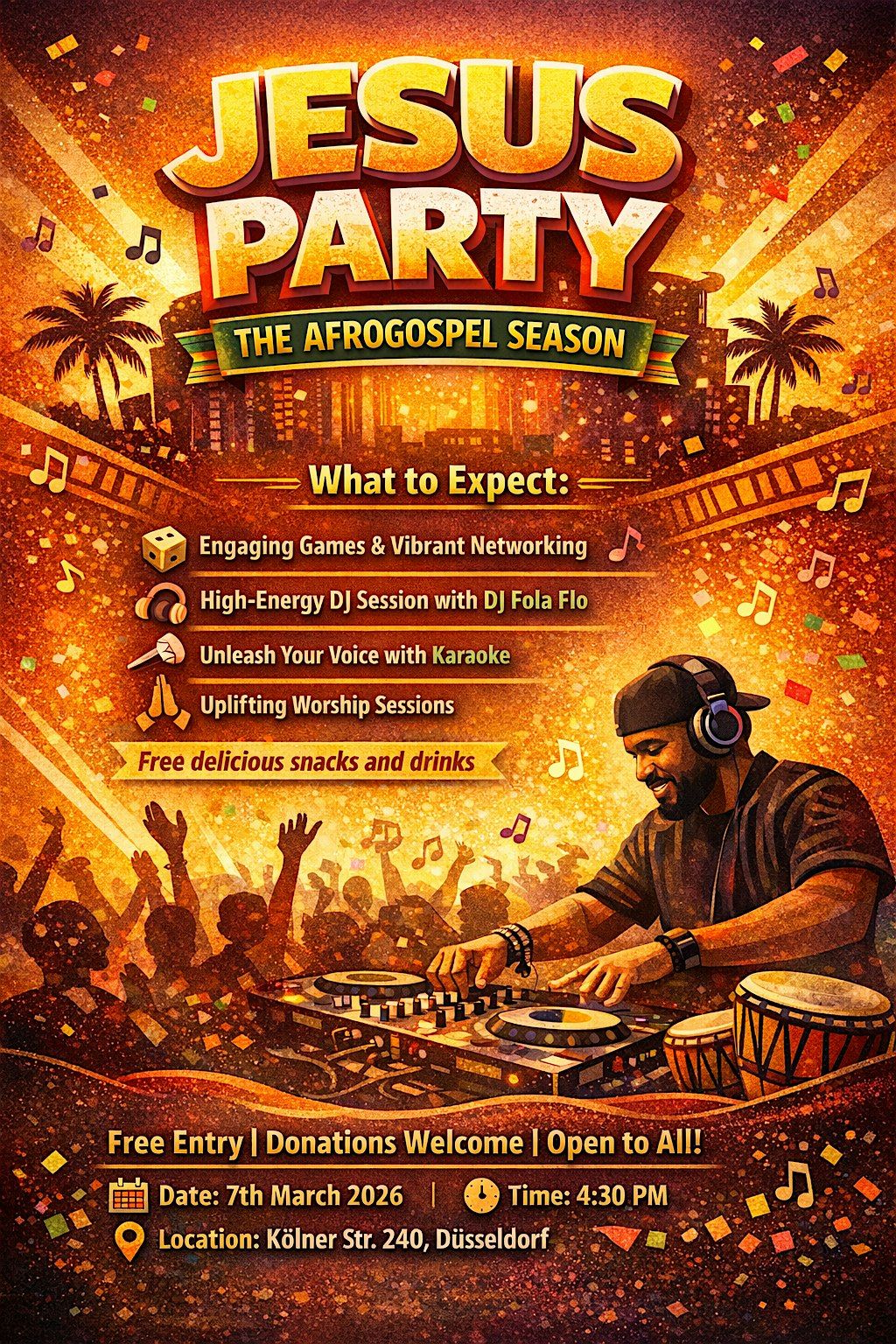Join us for the next electrifying Jesus Party (AfroGospel Season) – a night where faith meets fun, and we take the dance floor back for Christ!