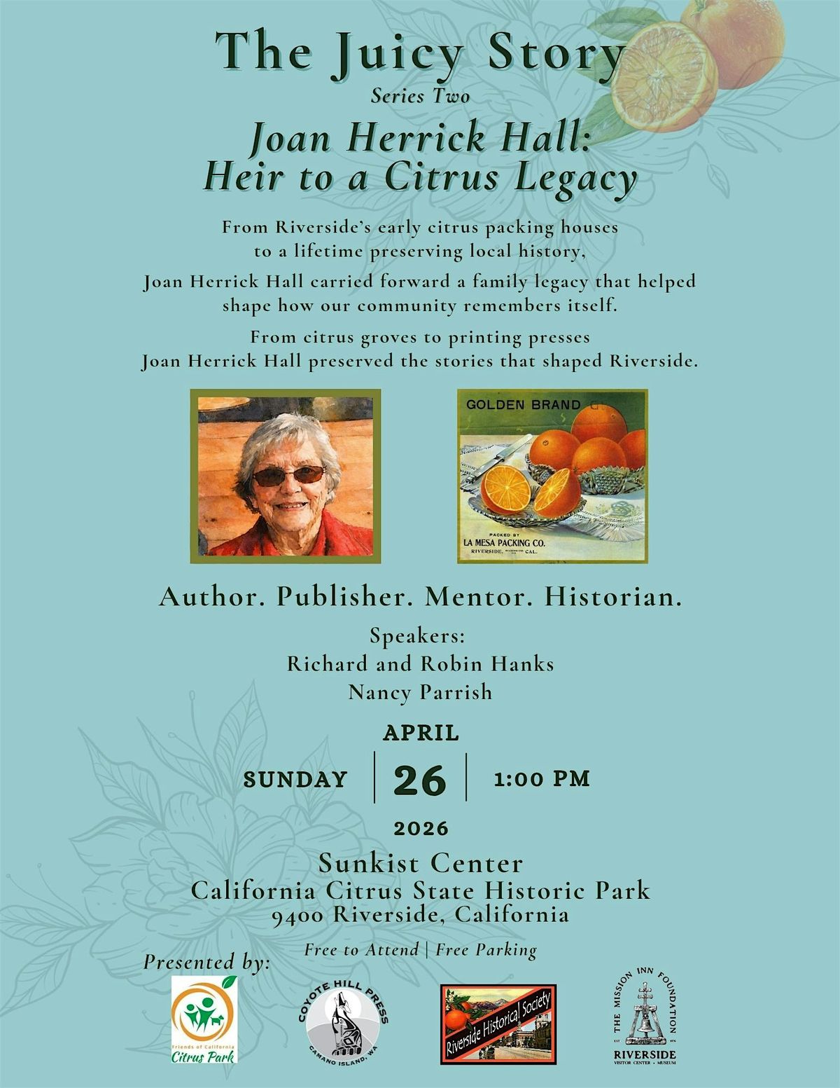 From Riverside's early citrus packing houses to a lifetime preserving local history, Joan Herrick Hall carried forward a family legacy that helped shape how our community remembers itself. From citrus groves to printing presses, Joan Herrick Hall preserved the stories that shaped Riverside.