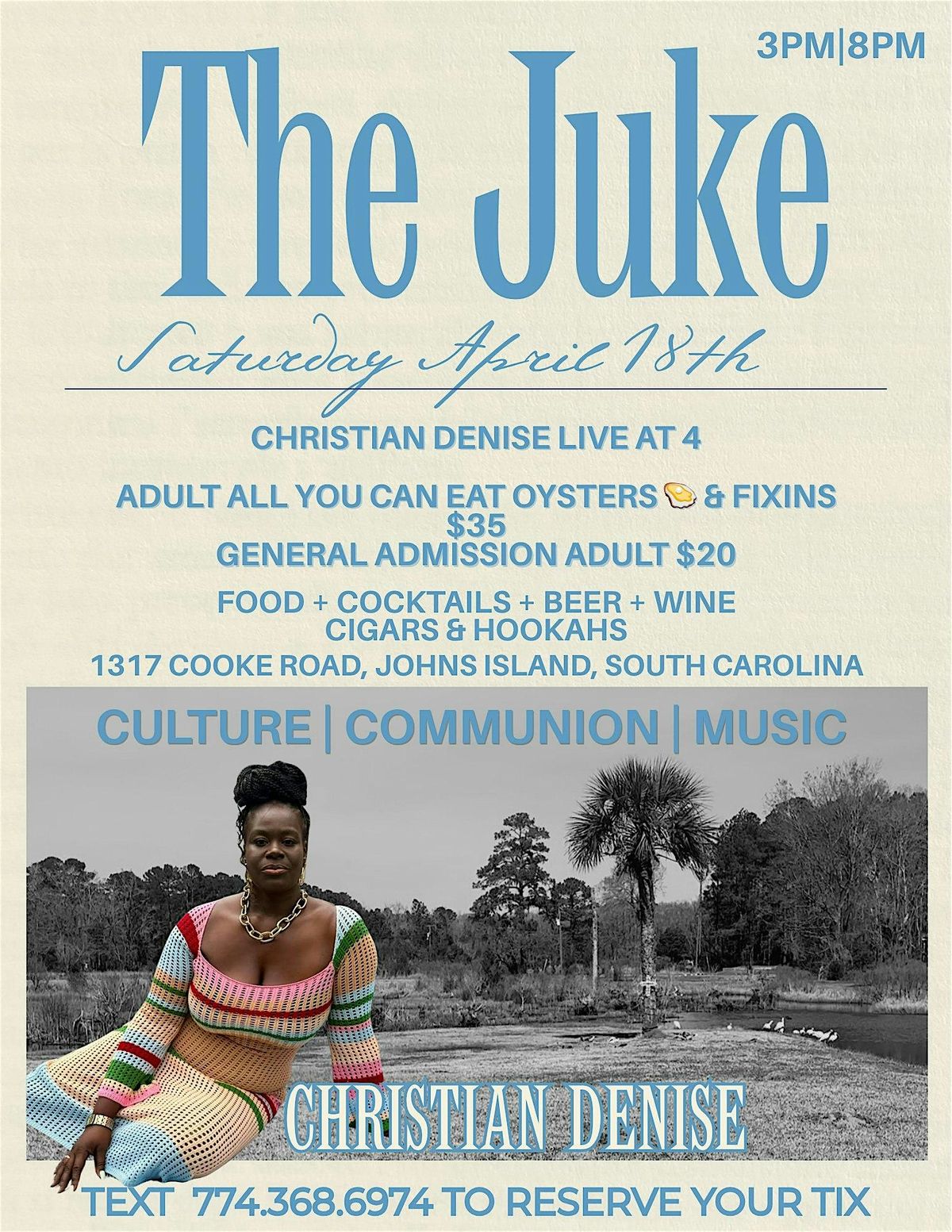 Enjoy AYCE oyster roast, libations, and powerful vocals from Christian Denise & band, plus live visual art curation by Kolpeace ahead of his Gibbes Museum debut on 4.28.26